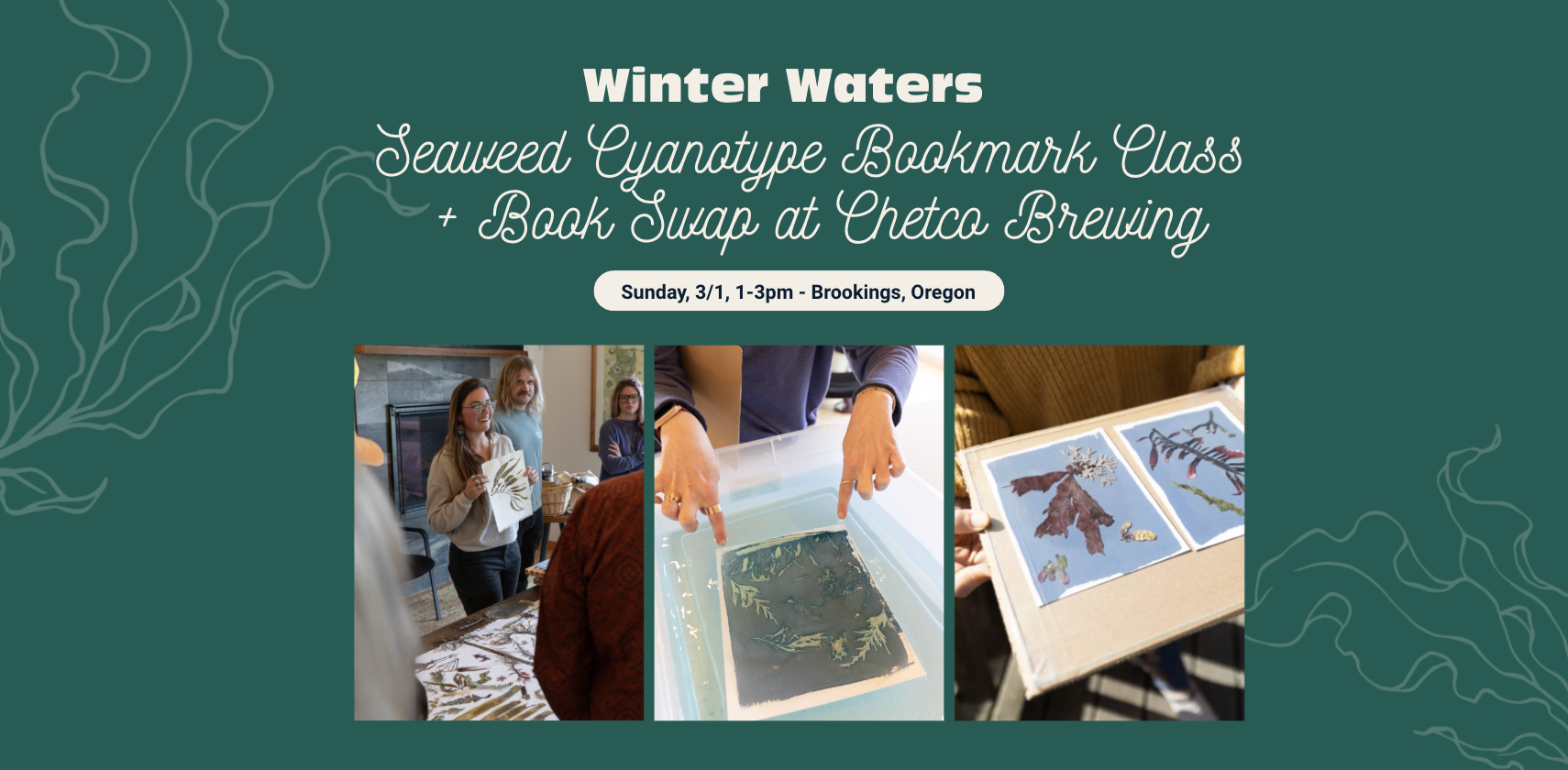 Join us for this FREE event at Chetco Brewing, where Winter Waters co-founder Alanna Kieffer will lead a demonstration on how to make your own seaweed cyanotype bookmarks to take home! Bring an ocean related book or seafood related cookbook to swap.